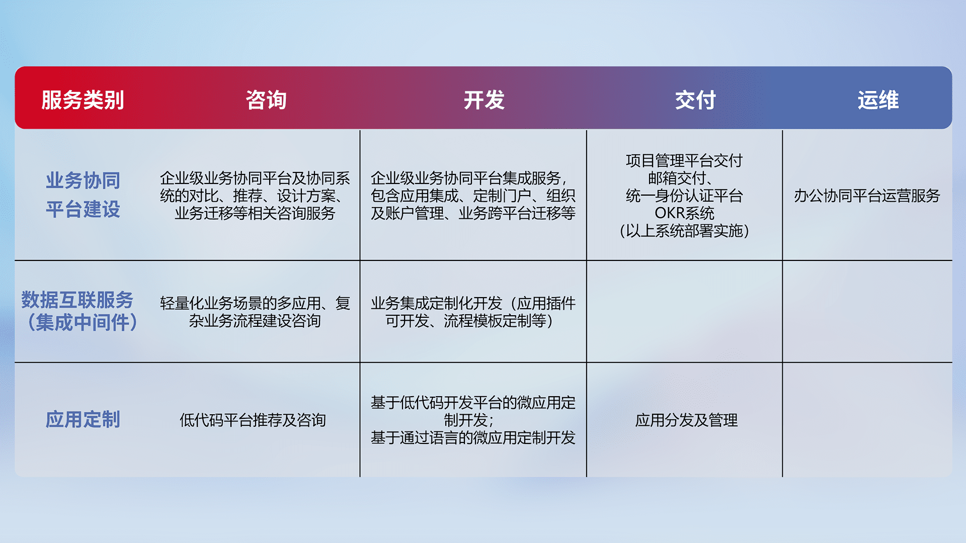 针对钉钉、、、、企微、、、IDaas等平台级产品提供产品的规划、、方案、、交付、、、、定制化开发等服务,,实现如统一协同办公、、、、智能客户服务、、混合会议管理、、、、智能数据查询、、、、等业务场景,,,,实现数字化转型。。。